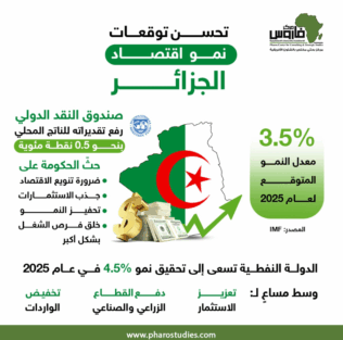 ووفق إنفوجراف لمركز فاروس للاستشا رات والدراسات الأفريقية، تطمح الجزائر أن يصل معدل النمو بنهاية العام الجاري إلى 4.5 % ن وسط مساع لتعزيز الاستثمار ودفع عجلة القطاع الزراعي والصناعي وتخفيض الواردات.