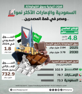 ووفق إنفوجراف لمؤسسة “ماعت جروب” يبلغ سوق الشيكولاتة بالشرق الأوسط 2.84 مليار دولار عام 2025، وتعتبر مصر والإمارات والسعودية الأكثر تصديرا.