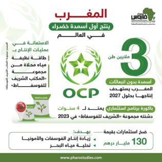 المغرب ينتج أول أسمدة خضراء في العالم.. من المتوقع أن ينتج المغرب أول أسمدة خضراء بدون انبعاثات كربونية في العالم بحلول 2027 مستعينا بطاقة نظيفة ومياه محلاة من طرف مجموعة “المكتب الشريف للفوسفاط” (OCP)، المملوكة للدولة.