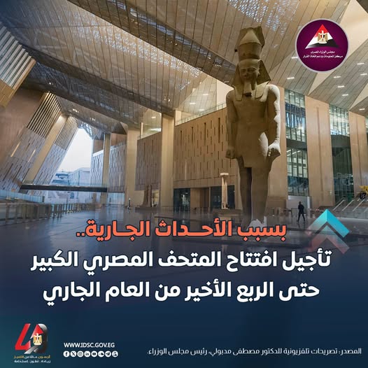 نشر مركز المعلومات ودعم اتخاذ القرار بمجلس الوزراء، اليوم السبت، على صفحته الرسمية عبر أحد مواقع التواصل الاجتماعي “فيس بوك” إنفوجرافا جديدا يسلط الضوء على تأجيل افتتاح المتحف المصري الكبير ليكون في الربع الأخير من العام الجاري بسبب الأحداث الجارية.