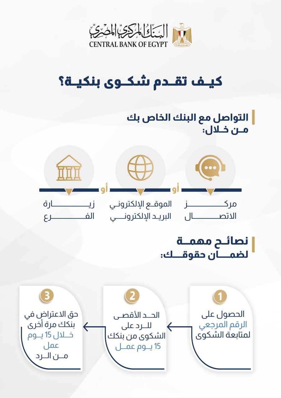 قدم البنك المركزي المصري، اليوم الأربعاء، شرحا مفصلا بالخطوات عبر الإنفوجراف والفيديو، كيفية تقديم الشكوى البنكية من عملاء القطاع المصرفي.