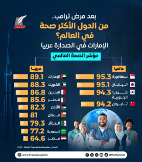 ووفق إنفوجراف لمؤسسة “ماعت حروب” حازت سنغافورة أعلى مرتبة في تصنيف الدول ذات الوضع الصحي الأفضل في العالم، بنسبة 95.3% في التصنيف العالمي، وجاءت اليابان في المركز الثاني بنسبة 95.1%.