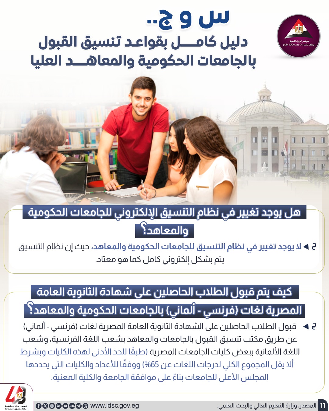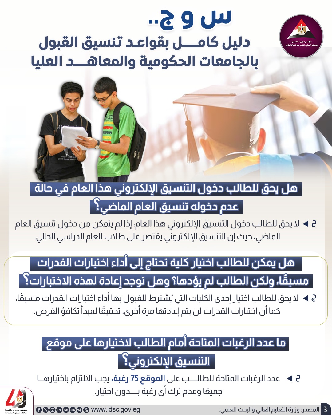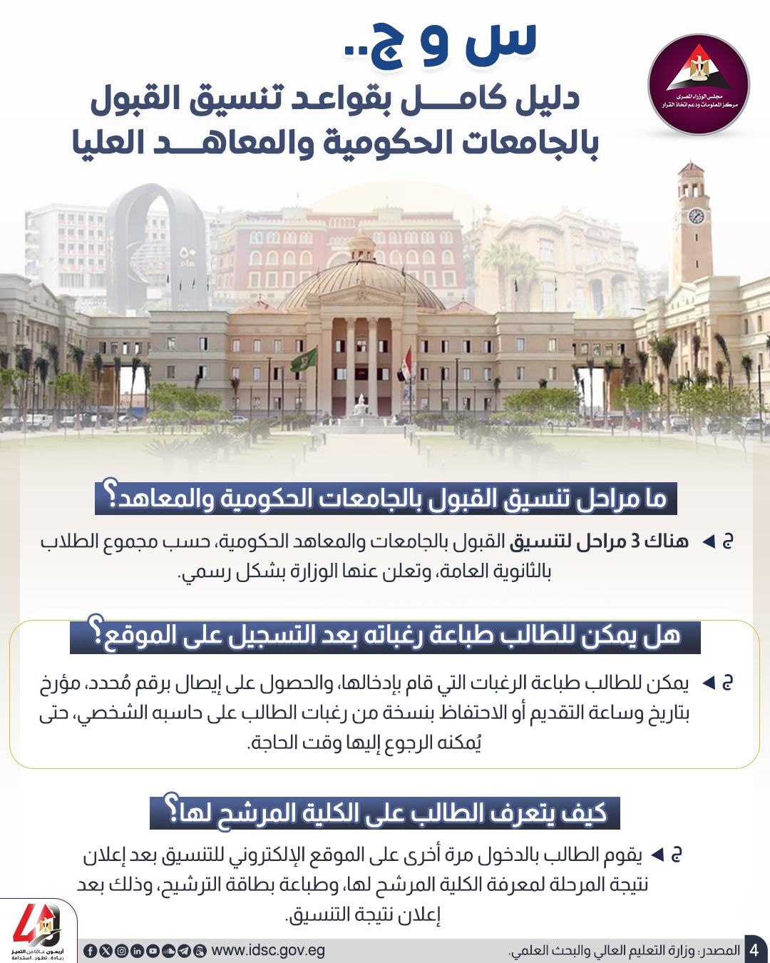 نشر مركز المعلومات ودعم اتخاذ القرار بمجلس الوزراء، اليوم الثلاثاء، على صفحته الرسمية عبر أحد مواقع التواصل الاجتماعي “فيس بوك”، إنفوجرافات مهمة تجيب عن أهم 25 سؤالا عن تنسيق الجامعات والمعاهد للعام الدراسي الجديد.
