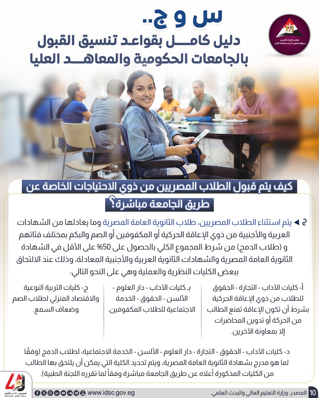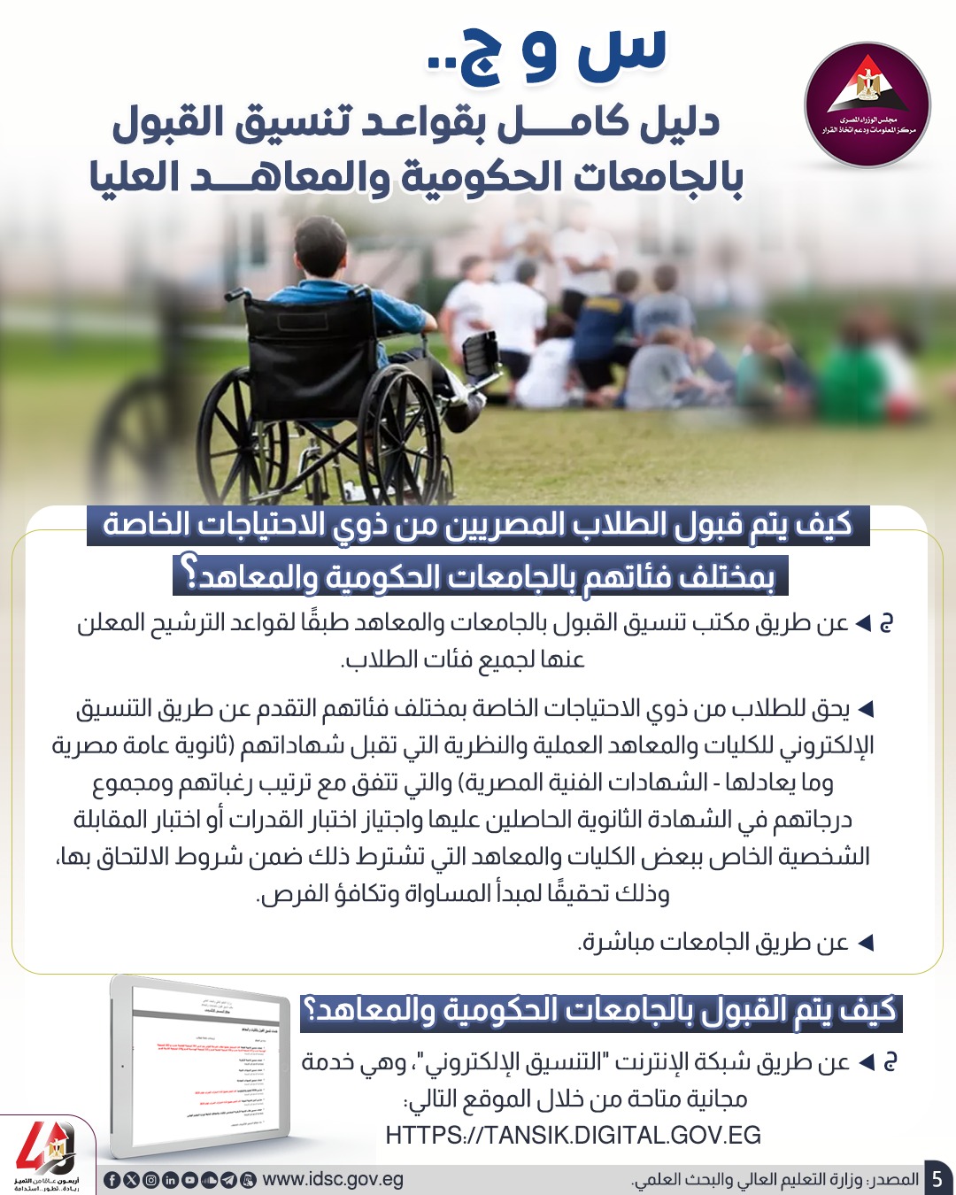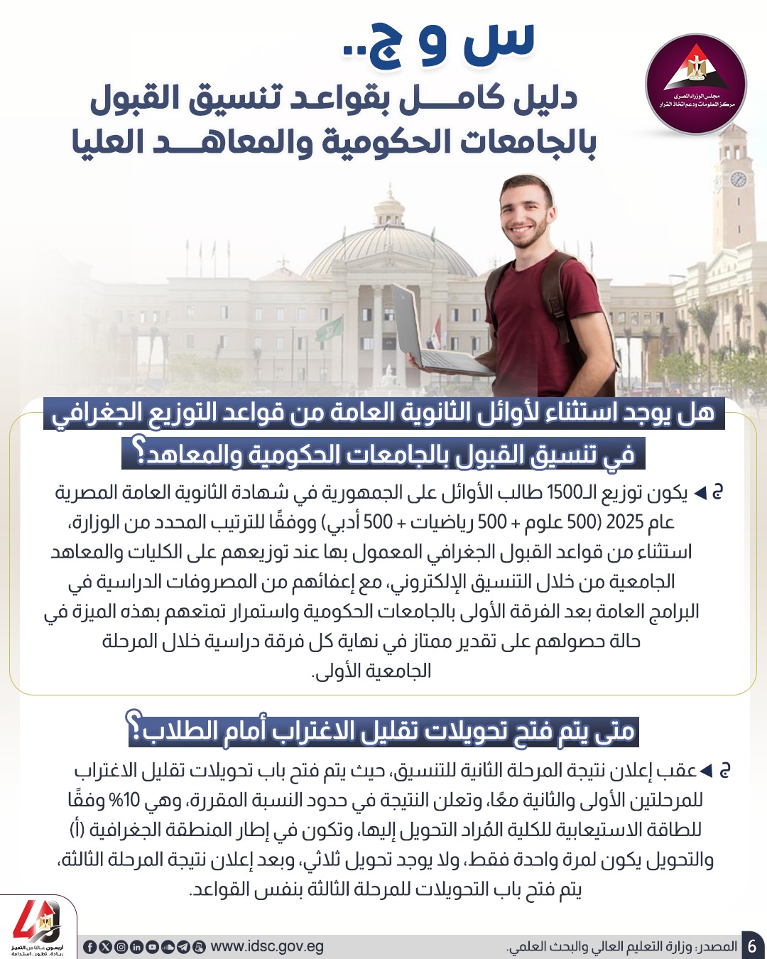 نشر مركز المعلومات ودعم اتخاذ القرار بمجلس الوزراء، اليوم الثلاثاء، على صفحته الرسمية عبر أحد مواقع التواصل الاجتماعي “فيس بوك”، إنفوجرافات مهمة تجيب عن أهم 25 سؤالا عن تنسيق الجامعات والمعاهد للعام الدراسي الجديد.