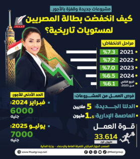 انخفضت البطالة في مصر بفضل مشروعات ضخمة مثل “الدلتا الجديدة” والتي يعمل بها ما لا يقل عن 5 ملايين شخص، وكذلك مشروع “العاصمة الإدارية” التي وفرت حوالي 1.5 فرصة عمل وفق إنفوجراف لمؤسسة “ماعت جروب” كما ارتفع الحد الأدنى للأجور إلى 7000 جنيه في يوليو 2025، ما يعكس تحسناً ملحوظاً في سوق العمل.