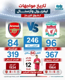 والتقى ليفربول مع أرسنال في 246 مباراة من قبل بمختلف البطولات، حقق الريدز 96 انتصارًا، فيما كانت الغلبة للجانرز في 84 مباراة، وحسم التعادل 66 مواجهة بينهما، وفق إنفوجراف لـ”شبكة رؤية الإخبارية”.