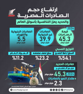 ارتفع إجمالي قيمـة صادرات مصر إلى 45.3 مليار دولار عام 2024 مقابـل 42.6 مليار دولار عام 2023 بارتفاع بلغت نسبته 6.5٪. وفق بيانات رسمية.