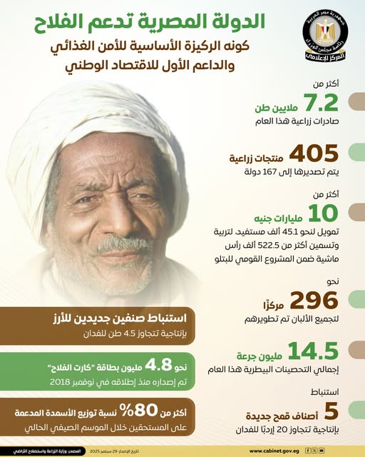 تواصل الدولة المصرية، دعم الفلاح كونه الركيزة الأساسية للأمن الغذائي من خلال مبادرات ومشروعات استراتيجية كبرى، أسهمت في زيادة الصادرات الزراعية إلى أكثر من 7 ملايين طن هذا الموسم.. كما شملت الجهود تطوير مراكز تجميع الألبان، واستنباط أصناف جديدة من القمح والأرز، وإصدار 4.8 مليون بطاقة “كارت الفلاح” ضمن خطة رقمنة الخدمات الزراعية.