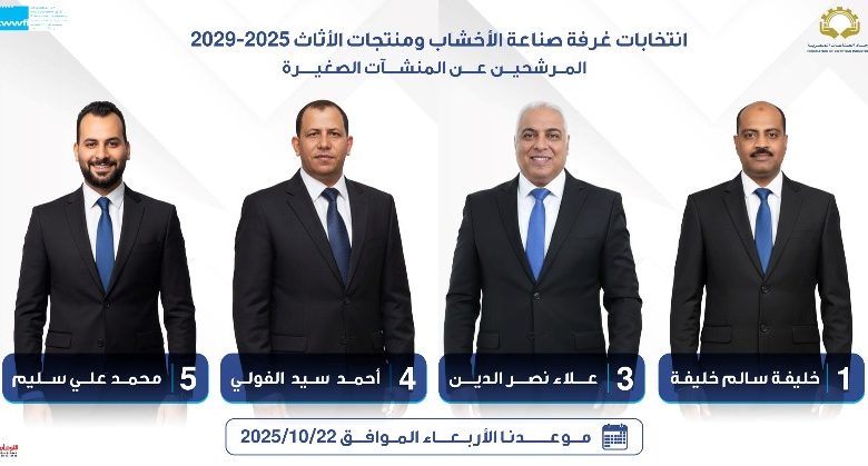 تجرى انتخابات غرفة صناعة الأخشاب والأثاث باتحاد الصناعات المصرية يوم الأربعاء المقبل الموافق 22 أكتوبر بمقر الاتحاد، وسط أجواء تنافسية بين المرشحين على مقاعد الغرفة للدورة الجديدة، خاصة في فئة المنشآت الصغيرة.
