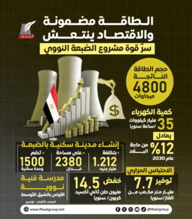 ووفق إنفوجراف لمؤسسة “ماعت جروب” تبلغ قدرة مشروع محطة الضبعة النووية لتوليد الكهرباء 4800 ميجا وات، مع توفير 7 مليار متر مكعب من الغاز لخفض 14.5 مليون طن من ثانى أكسيد الكربون سنوياً.