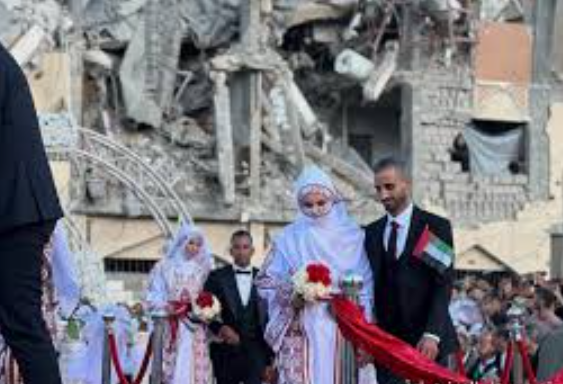 ونُصبت منصة الزفاف بين الركام التي حملت عنوان “ثوب الفرح”، تعبيرا عن إرادة الحياة وصنع الفرحة برغم القتل والتدمير بفعل حرب الإبادة الإسرائيلية.