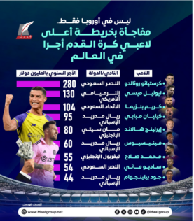 وجاء لاعب النصر السعودي براتب سنوي مذهل يصل إلى 280 مليون دولار، يليه ليونيل ميسي نجم إنتر ميامي الأمريكي والذي يتقاضى 130 مليون دولار سنويا.