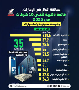 وبلغت القيمة السوقية لأكبر 10 شركات عامة في الإمارات نحو 692.3 مليار دولار. وتصدرت القائمة الشركة العالمية القابضة، مستحوذة وحدها على نحو 34% من إجمالي القيمة السوقية، وفق إنفوجراف لـ”مؤسسة ماعت جروب”.