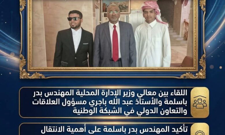 التقى معالي وزير الإدارة المحلية المهندس بدر باسلمة بالأستاذ عبد الله باجري مسؤول العلاقات والتعاون الدولي في الشبكة الوطنية لبحث سبل تعزيز التعاون المشترك وتطوير منظومة الحكم المحلي بما يضمن شمولية القرارات وكفاءة الأداء الإداري.